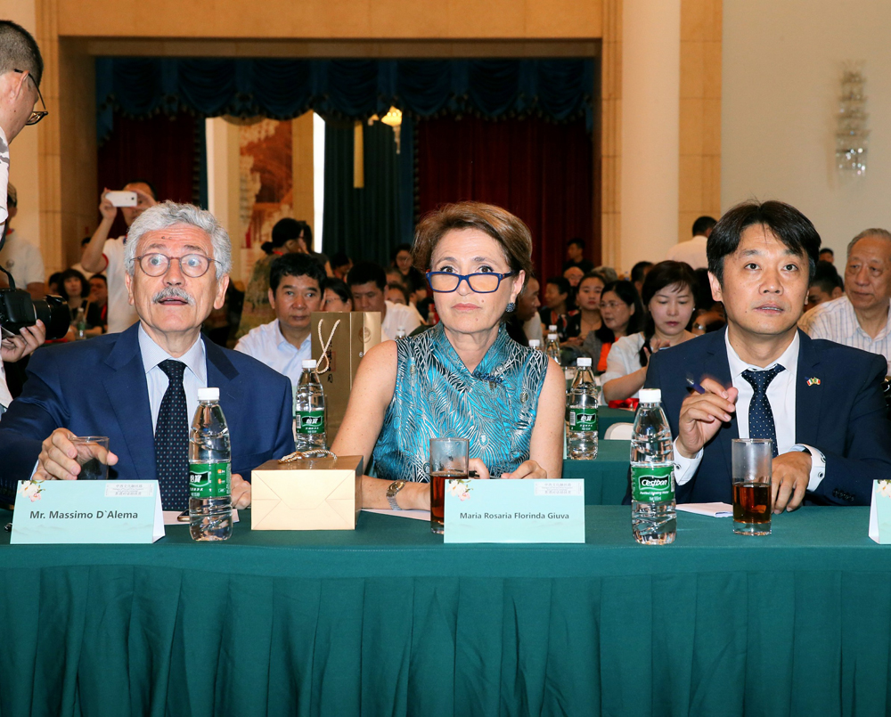 图:意大利前总理马西莫.达莱马(左一)与丝绸之路城市联盟研究院院长刘志勤(右一) 大公报记者朱烨摄
