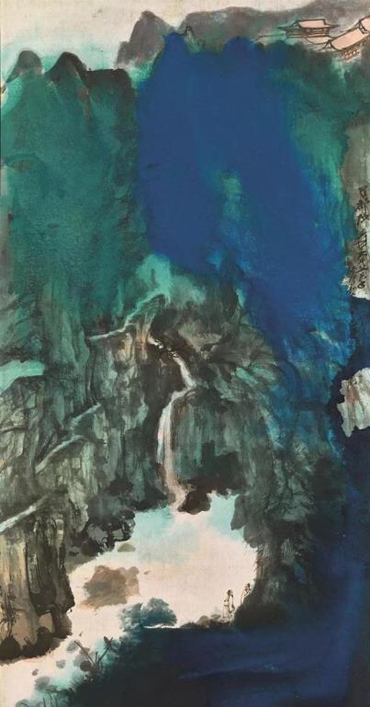 每一个朝代,总有最具代表性的画家或艺术家出现,自晋以来,至清,至现代,皆有表表者。佳士得拍出的张大千《观泉图》,即有人谈论在艺术突破方面的成就比成交价值更高,这方面得到艺术界认同。此画全幅採用泼彩技法,浓重的墨色,沉郁石青色在纸上流动扩散,两位高士漫步山道上,仰观气势磅礴的瀑布。画家用石青、石绿泼出山体、植被,如长绿由山峰泻下,气象万千。又以明亮绚丽石绿,勾勒山体肌理,高境界在于画家的笔触若隐若现。创作年份一九六三年,画家晚期在泼彩运用得心应手。他的泼墨泼彩使他成为这时代的代表人物。