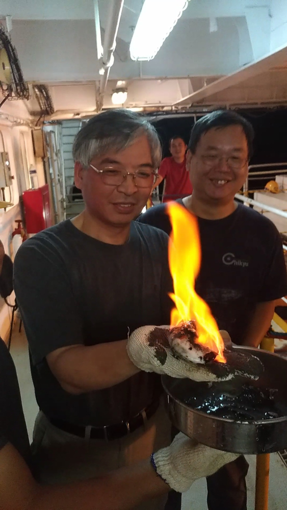 21日凌晨4点多,“玛丽杜凡号”上的科学家都齐聚在海上实验室外边的狭窄通道上观看这个新发现的“白雪糕”,首席科学家许树坤并以打火机点燃正在缓缓解离中的天然气水合物,白色的“冰雪糕”释放出来的甲烷气燃烧出红色的火焰,也照亮了台湾未来新能源的曙光。