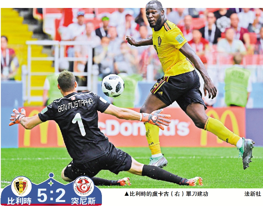 【大公报讯】世界杯小组赛G组次轮赛事“欧洲红魔鬼”比利时对非洲球队突尼斯周六开打,双方于上半场便大打进攻足球,比利时先有夏萨特博得十二码并于六分钟先开纪录,10分钟后卢卡古射成2:0,被围攻的突尼斯亦依靠死球头槌顶成1:2,不过卢卡古于补时阶段入波而梅开二度成3:1完半场。比利时于下半场再有夏萨特再入一球今仗也梅开二度,加上多次埋门的后备锋将巴舒亚伊取得入球射成5:1,突尼斯也于补时三分钟“埋斋”,比利时以5:2胜突尼斯,具霸气地全取三分,于首两轮赛事均取大胜。/大公报特派记者 何嘉轩