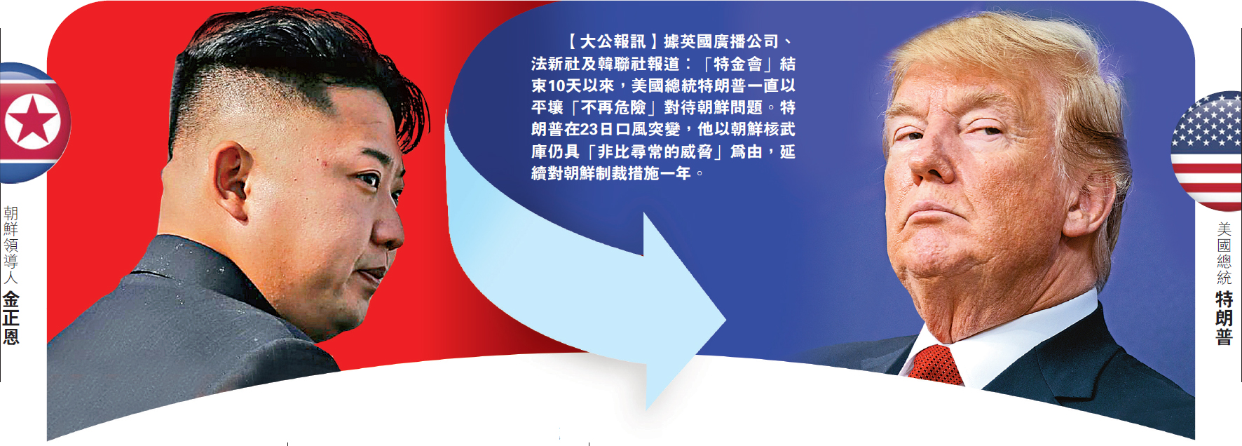 【大公报讯】据英国广播公司、法新社及韩联社报道:“特金会”结束10天以来,美国总统特朗普一直以平壤“不再危险”对待朝鲜问题。特朗普在23日口风突变,他以朝鲜核武库仍具“非比寻常的威胁”为由,延续对朝鲜制裁措施一年。