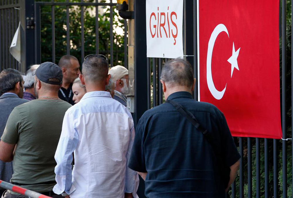 图:7日,在德国的土耳其人排队投票/美联社
