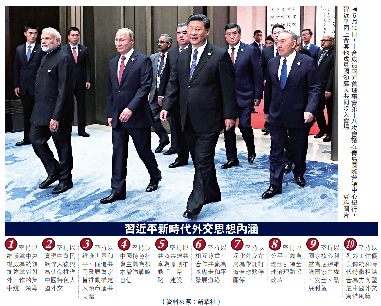 图:6月10日,上合成员国元首理事会第十八次会议在青岛国际会议中心举行,习近平同上合其他成员国领导人共同步入会场/资料图片