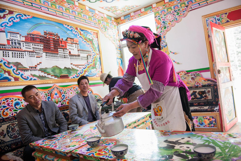 图:在四川旅游村寨,店员在给游客倒酥油茶 /资料图片