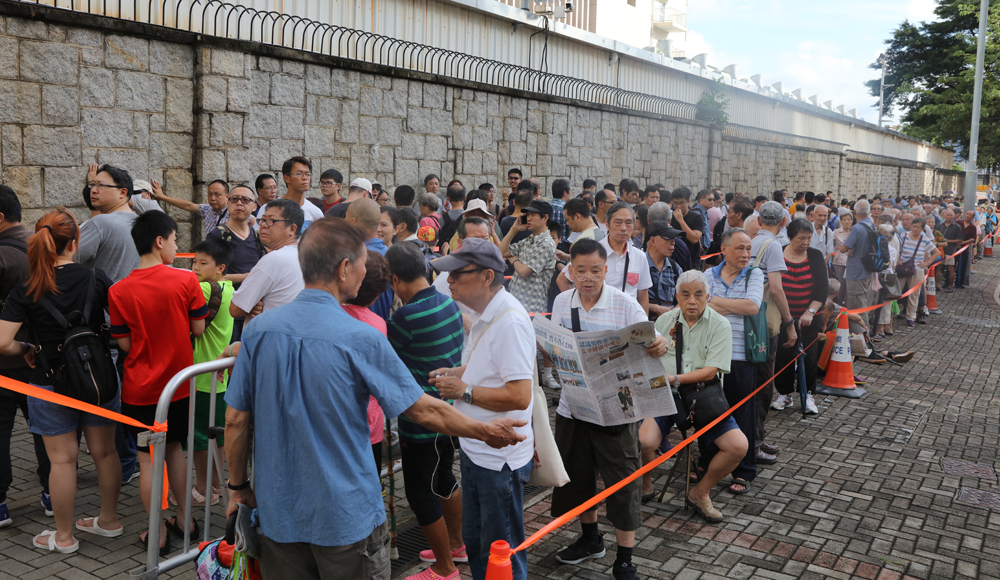 解放军驻港部队昨早八时半开始派发门票,但各个军营门口一早已经“大打蛇饼”。中环军营门口有近500人排队,另一侧是专为70岁以上长者及残疾人士设置的“绿色通道”,亦有近百人排队。高温加上暴晒,市民仍坚持排队。新围军营、石岗军营均有百人排队,枪会山军营更有近400人排队,六个军营的参观券原定于中午12时半派发结束,每人限领四张,最终各军营提前30分钟派完门票。