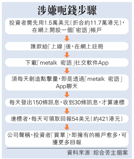 今年六月,西九龙重案组亦侦破一宗层压式骗案,案中155名受害人涉款约5800万元。涉案的三间本地投资公司于去年11月期间,向苦主声称有电影、地产及邮轮等多种投资项目可选,保证三个月内领回本金,一年后可获逾13倍利润,转介给他人又可再获利润,今年五月苦主发现投资户口故障,才向警方报案,警方拘捕七男五女。