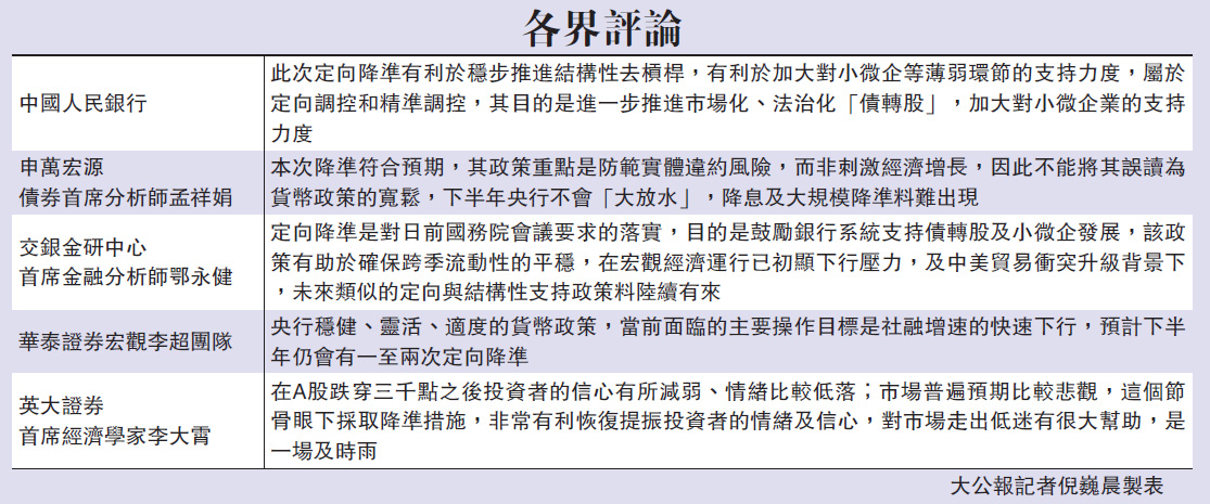 中国央行周日一如市场预期宣布定向降准,从七月五日起,调降国有大型商业银行、股份制商行、邮政储蓄银行、城商行、农商行以及外资银行存款准备金率0.5个百分点,用于支持市场化法治化“债转股”项目及加大对小微企业的支持,共释放资金约7000亿元(人民币,下同)。央行表示,此次定向降准属于定向调控和精准调控,有利于稳步推进结构性去槓桿和加大对小微企等薄弱环节的支持力度。受访专家表示,今次降准符合预期,是对前期市场预期中的流动性偏紧,以及社融规模的过度收缩的回应,降准资金的释放将一定程度纾缓市场情绪。\大公报记者 倪巍晨