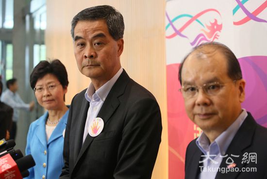 梁振英(中)早于竞选政纲承诺,“研究为低收入家庭提供生活补贴”。图左为政务司司长林郑月娥、右为劳工及福利局局长张建宗/资料图片