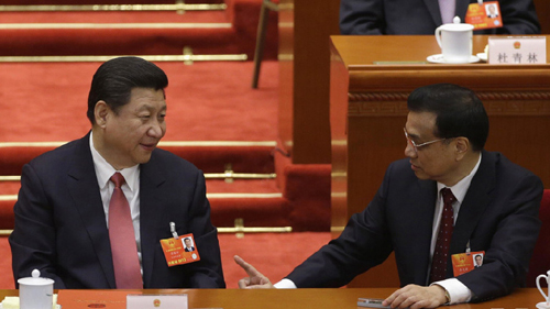在主持人张德江宣布议程的同时,李克强拿起报告,向习近平询问着什么,习近平则侧过头来对报告指指点点。两人似乎在交流报告的内容。
