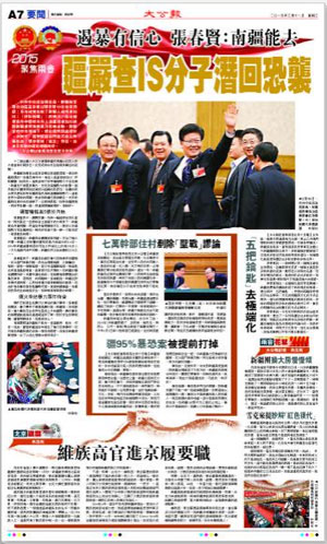 张春贤说,相信新疆有极端分子参与了IS组织,这更说明世界上极端势力不容忽视,新疆也不会置身事外。他将新疆打击暴恐犯罪“上升”到了世界高度,张表示,各国的政治家也都在采取各种措施,遏制这种极端组织。新疆主席:警惕极端分子“狗急跳墙”