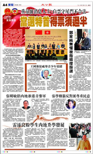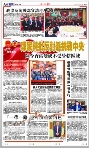 吕新华:对于香港的政改发展问题,中央的立场是一贯的和明确的,就是中央政府坚定不移的支持香港特别行政区依法循序渐进的发展民主,最终达至普选。吕新华:苏荣对政协声誉损害很大