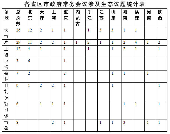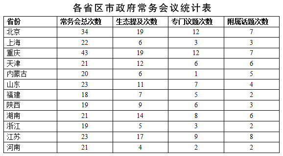 284次省府常务会议,共提到生态文明相关话题129次,占比达45.4%,接近一半;平均每个省提及次数为10.75次。从绝对值看,北京、重庆、湖南、江苏、天津、山东六省市提及次数超过10次,河南省最少仅有4次。这从一个方面说明了生态文明在该省政务工作中的“分量”。