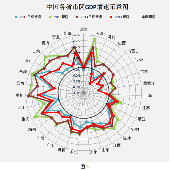 先来看看舆论最关心的地方生产总值与增速。图1以雷达图形式显示了2013、2014的增速和2014、2015的预期增速。一个最直观的呈现,便是这四个圈在逐渐收缩。与各地2014年的目标相比,因为新常态的到来,31省份增速无一达标,最接近的则是重庆,其次是北京。与目标相比,落差最大的是山西(-4.1%),其次是辽宁(-3.2%)。如果与2013年增速相比,落差最大的仍是山西(-4%),云南并列最大。看来,山西2014年政坛遭遇地震,经济同样如此,两者具有高度正相关。