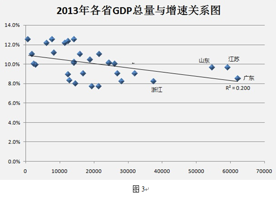 图2显示了2014年各地GDP总量与增速的关系图。如果做一条趋势线我们发现,虽然地方GDP与增速仍有负相关,但已经相当微弱,分布更像是个喇叭型:GDP总量低的增速可以很低,也可以很高,差距扩大,而总量高的目前看来增速仍保持中上水平,绝对增量惊人。而2013年(图3),这种负相关性仍然较明显,各省分布较为集中。