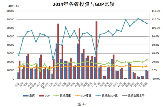 当前,经济下滑压力加大。通缩态势明显,稳增长似乎再度成为宏观经济政策最优先强调目标。在拉动经济的三驾马车(投资、消费、出口)中,固定资产投资成为官方拉动经济稳增长的最主要手段。纵观各省2014年固定资产投资,绝大多数超过GDP增幅,不少是后者的两倍多。有22个省市投资增速超过全国平均值(15.3%),其中16个位于中西部。与GDP增速相比,投资增速的地域差距更大,最高的新疆达到了25%,最低的辽宁甚至为-1.5%。