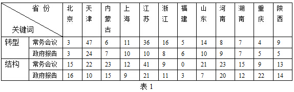 经过表1统计可以看出,各地出现“转型”与“结构”的频次有很大的差距。北京市总计出现了37次,福建仅14次。而江苏和天津最高,分别出现108次和95次。