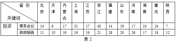 同样,在我们选取的12个省市样本中,以同样的方式统计,可以观察到目前投资的多种形态。表2显示,浙江、上海、内蒙古“投资”出现的频次排在前三。浙江以“411”有效资行动计划进行有效与定向投资,并加强民间投资培育,加大企业技改力度,进一步调动民间投资的积极性。同时,浙江还在投资体制改革上大气力,如编制企业投资项目核准目录,确立企业投资主体地位,加大简政放权力度,切实转变政府投资管理职能等。