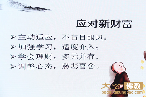 对于财富的分类和取舍,他开示说:所谓财富,有世间财富和出世间财富之分。世间财富,总的来说,也可分为两大类:一是物质财富,二,是精神财富。出世间财富即是以无分别的般若智慧为根本财富,以明心见性、证悟宇宙法界本来面目、乃至生命的彻底解脱为终极财富,常乐我净是其四德(涅槃);而世间物质财富,又有固定资产如黄金与房地产等实物和流动资产之分。流动资产有货币、有价证券等。事实上,世间所谓的固定资产也是无常的,即便拥有,也只有相对的稳定性(“住”),设备会损耗,房屋会折旧。何况市场的不确定性也使得财富的增减、波动、起伏变得难以捉摸,甚至不可思议。佛法告诫我们:这些财富都是生带不来,死也带不去的,唯有业随身。如果说还有什么可以称之为人生的固定资产,那就是心灵财富,心灵财富可以分享,但不可以被剥夺;物质财富则不然,损减散失极为容易。心灵财富中,唯有佛教所讲的功德法财较为殊胜,虽无形,却不会随着我们的一期生命终结而消亡,不会随着生命存在方式的轮回而失去价值。虽然从佛教终极价值来观察,尚属有漏种子,非究竟之德,关于这一点,可从达摩祖师与梁武帝的对话中得窥一豹。但在有为法中,这些有漏善种不会坏失,依然会在人天途中循环转辗,为我们带来丰厚的回馈。