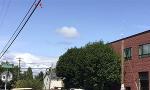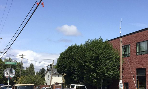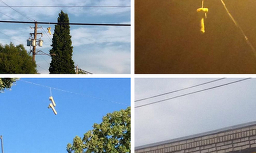 在美国的俄勒冈州的波特兰城市的商业街道的电线杆上悬挂了数百个性用品。