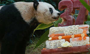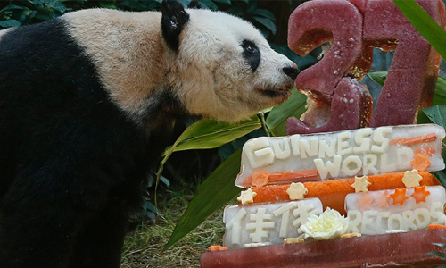 据合众国际社报道,为庆祝其生日,香港海洋公园的饲养员还特地为它准备了用竹子和蔬菜、红石榴、薄荷糖等制成的蛋糕。