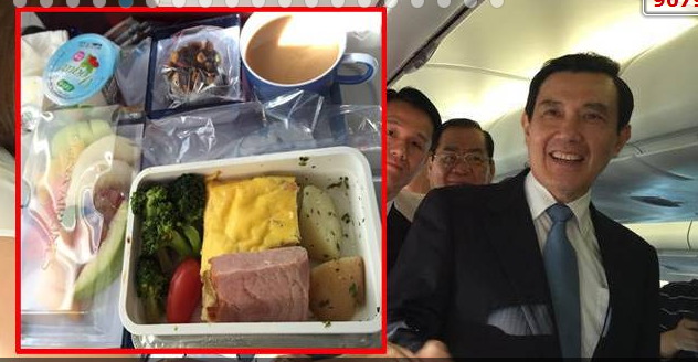 马英九专机10点半左右抵达新加坡樟宜机场,专机为华航云门彩绘机,内设“军情室”,幕僚人员可为其提供最新讯息。专机菜单曝光,包括早餐及回程晚餐,内容相当丰富精致。