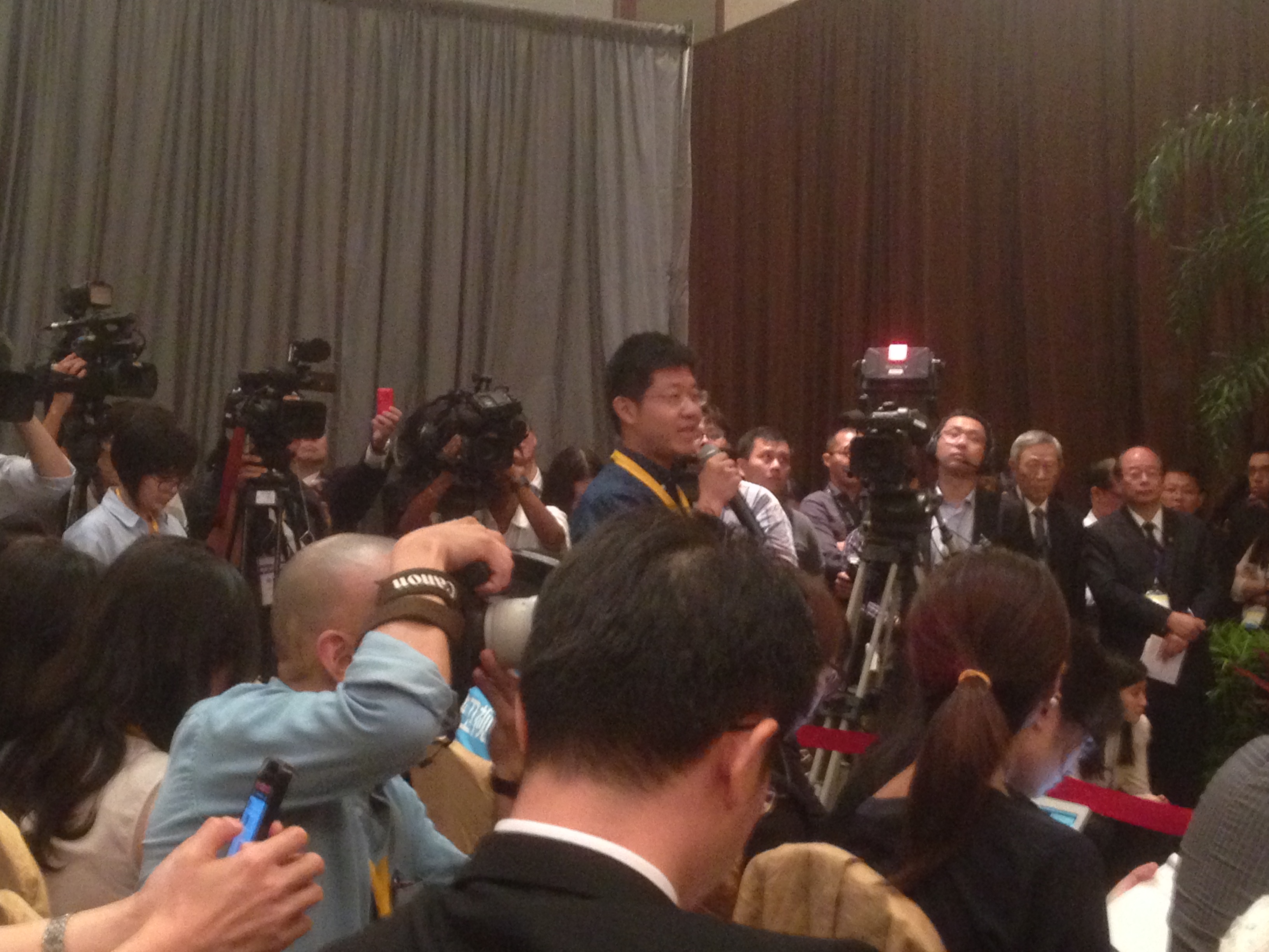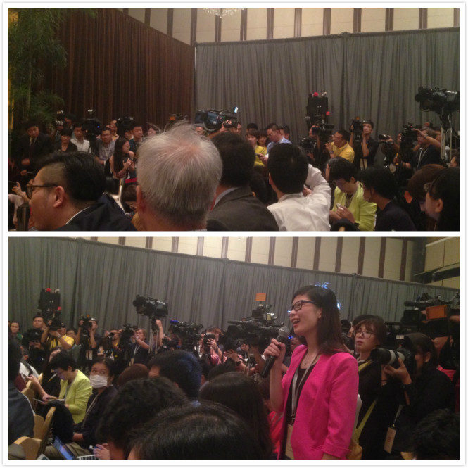台湾记者周玉寇在现场大声喧哗要求提问。