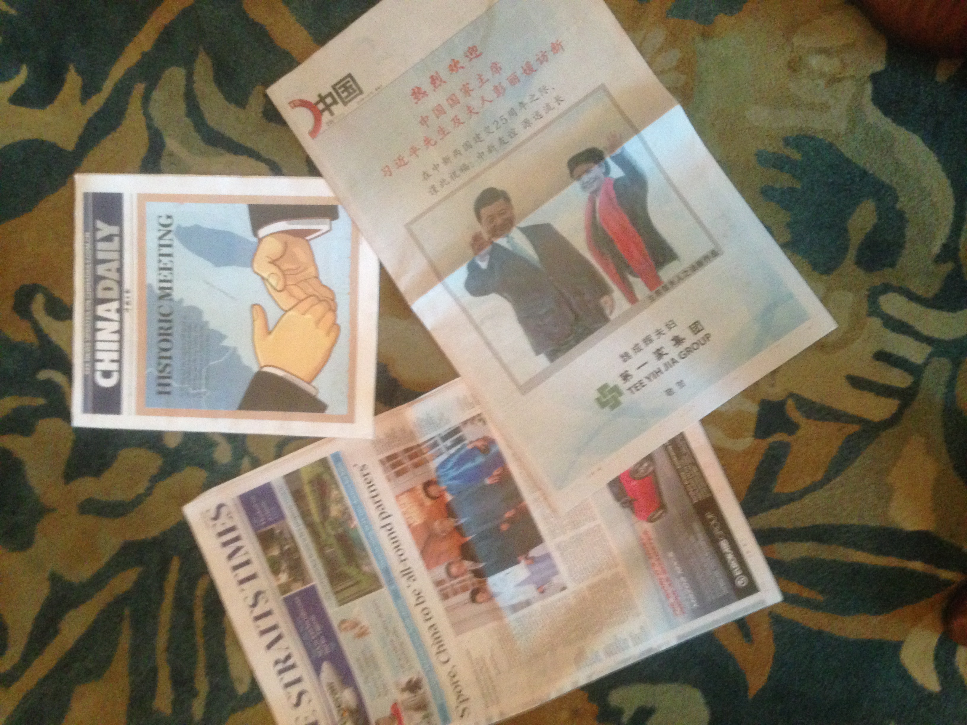 “习马会”连日来跃上两岸及国际各大媒体的重要版面,新加坡这个美丽的花园城市再度见证两岸关系发展史上具里程碑意义的大事,扮演推动两岸关系和平发展的桥樑,赢得媒体镁光灯的青睐。图为新加坡本地的英文海峡时报以及中文联合早报都在显著位置报道习近平主席访新以及“习马会”。(大公报特派记者朱穗怡、曾庆业、李柏涛)