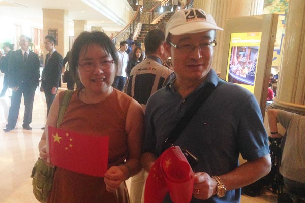 记者在现场看到拿着国旗前来加油的当地华侨谢氏夫妇,他们告诉记者很期待这次会面,希望能亲眼领略习主席的风采。谢先生说,这几天当地媒体全在报道习主席访新及习马会。(李柏涛)