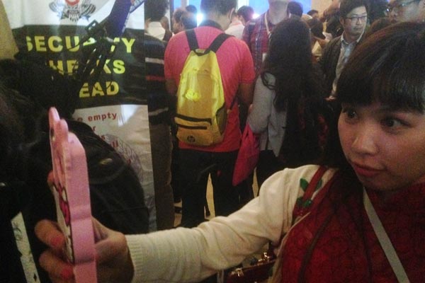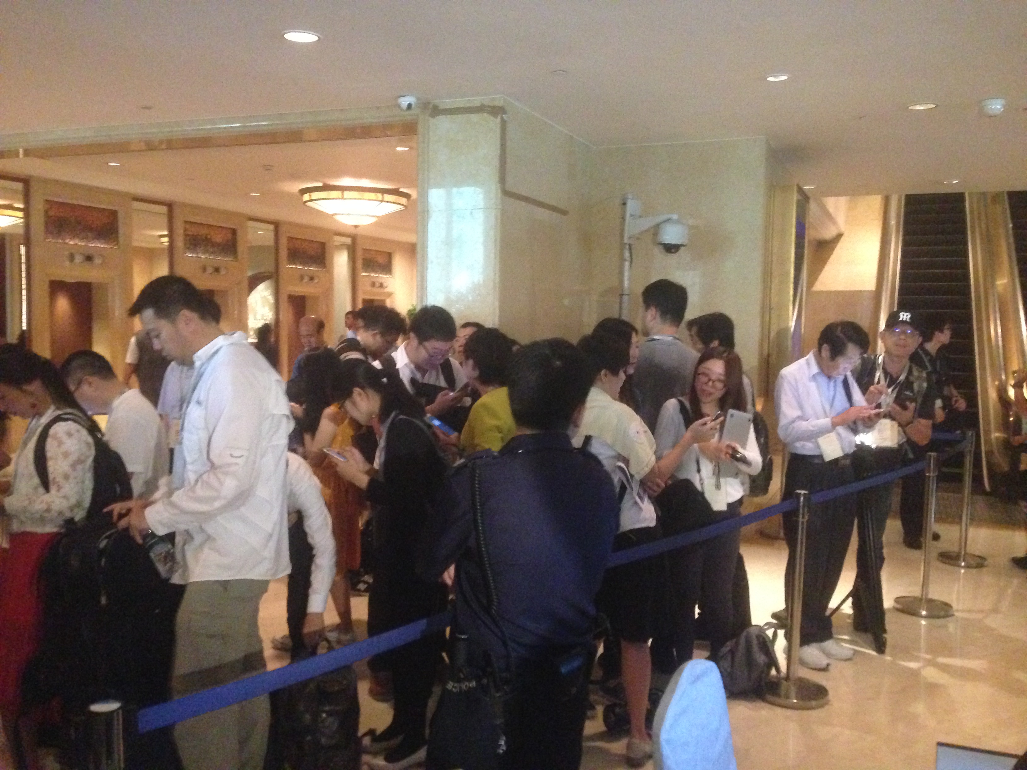 记者在现场等待安检,文字记者与电视记者将从不同的安检口通过。安检非常严格,所以等待时间很长,有许多记者玩起了自拍,还有记者站在高处俯拍。(李柏涛)