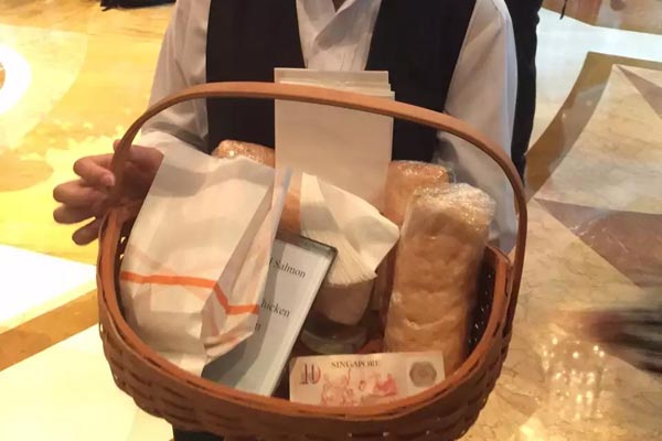 由于安检在中午举行,排队的记者几乎都没时间吃午饭,现场有人在卖三明治。10新币一个,三文鱼和鸡肉两种口味可选。(李柏涛)