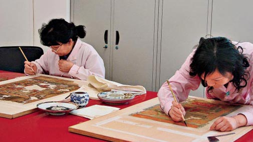 纪秀文师傅将半生装裱修复实践经验总结为四个字:敬、谨、精、细。敬,就是敬畏;谨,就是谨慎,说的是修裱书画的另一个功夫:“全色”。由于残损,修复时需要续笔成全画面。故宫人遵守的原则是“接画不接笔”。比如树枝残缺了,对照画中现存树木,可以模仿补全原作;但字迹残缺了,就不要生搬硬套,因为字写出来个个不同。精,精益求精;细,细致入微。