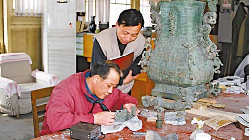 修复青铜器要做到四心:细心、专心、耐心、精心。细心,就是在破损严重的一堆碎片中“找对象,找邻居”,看茬口、弧度、薄厚、锈色来拼接成形。整形时要专心,焊接补配时要有耐心,要坐得住。精心就是做旧要精益求精。