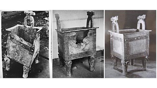 青铜器是悠久灿烂的中华文化的瑰宝之一,有“青铜文化”之称。她以中国人三四千年前起就拥有的高科技青铜冶炼铸造技术,以品类丰富多姿、造型精美新奇、纹饰缛丽神秘,乃至锈蚀斑驳各异,闻名于世。当我们今天在博物馆欣赏司母戊方鼎、司母辛方鼎、四羊方尊、马踏飞燕、班簋、蟠螭纹监等“国之重器”时,很少有人知道它们在出土时的模样。