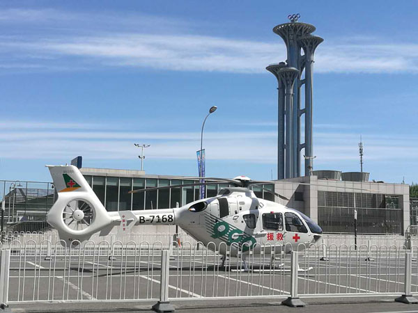 北京国家会议中心外,救援用直升机和急救车随时待命。