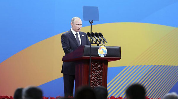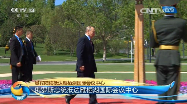 5月14日,“一带一路”国际合作高峰论坛开幕式在北京国家会议中心举行。这是俄罗斯总统普京在开幕式上致辞。图片来源:新华社