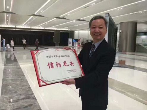 河南省信阳市长尚朝阳领回信阳毛尖入选“中国十大茶叶区域公用品牌”荣誉证书。