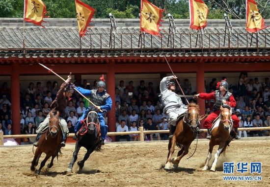 5月30日,演员在开封清明上河园景区大型实景节目《岳飞枪挑小梁王》中表演马战场面。