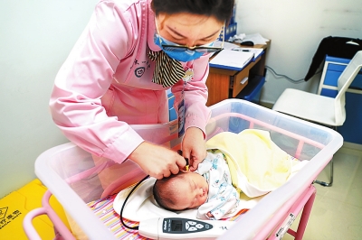 6月11日,郑大一附院郑东院区产科新生儿筛查室内,一名护士正在给新生儿做听力筛查。(记者 聂冬晗 摄)