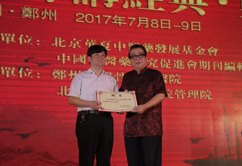 河南省中管局副局长张建锋(左一)为国医大师张大宁(右一)颁发“郑州中医骨伤病医院终身名誉院长”聘书