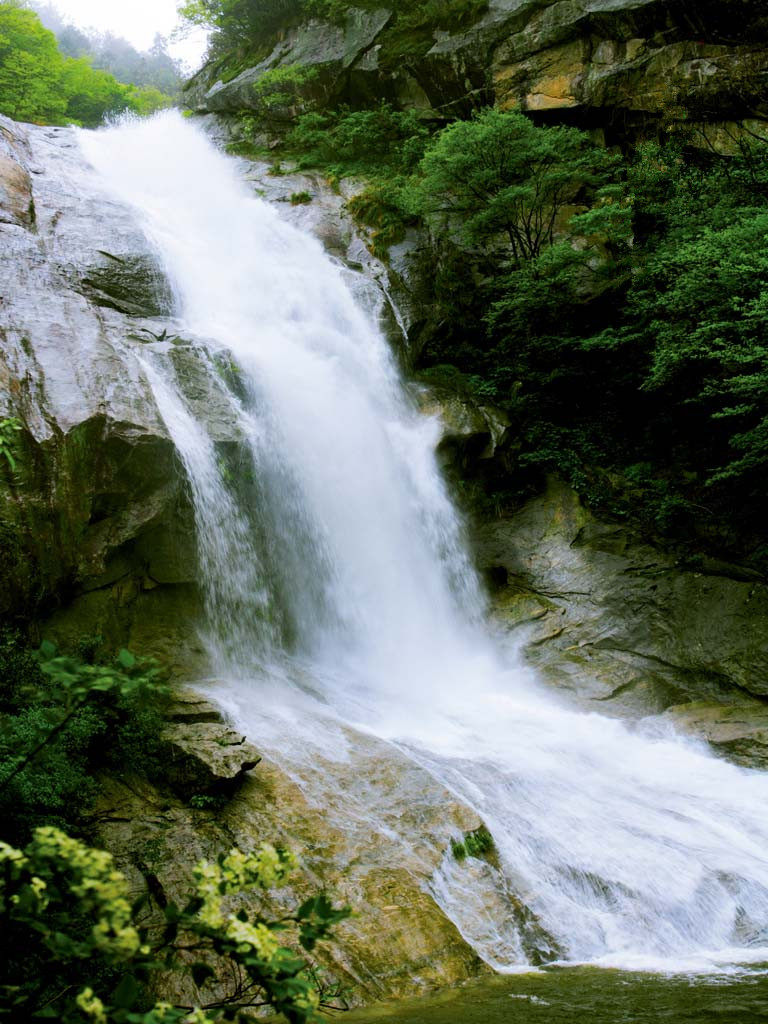瀑布从五十多米高空飞流而下,回环弯转,一波三折,形成上下相连的三潭。河水直砸潭石,卷来长风,落下惊雷,溅起珠玉,化作一潭甘霖。