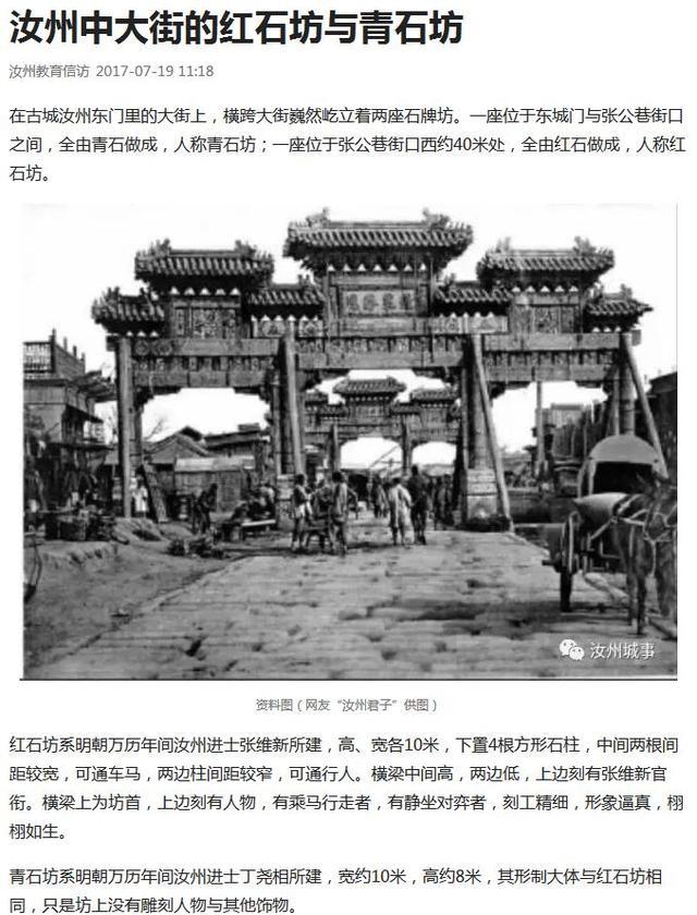 说到青石坊,我不仅想到了建造青坊的丁尧相,也想到了相隔不远的曾经的红石坊。坊间传说,青石坊是汝州明代进士丁尧相所建,红石坊是汝州明代进士张维新所建,并且丁尧相还是张维新的舅舅。上百度查询,查到有汝州进士榜,其中提到:“丁尧相,明嘉靖三十五年(1556年)进士,第3甲189名,曾任成都府推官,祀汝州乡贤祠。张维新舅父。”查清朝道光《汝州志》卷六·人物·乡贤记载:“丁尧相,字宗顺,嘉靖丙辰进士,捐金代完大户漕米,并捐买驿马入官,里民李逢元等被人诬告主鬻妻子,相捐金周全,又输腴田百余顷,赡养士子,多有游泮发科者。任成都府推官,祀乡贤。”