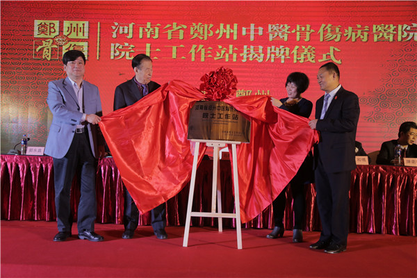 河南省中管局副局长张建锋、省院士工作办公室宋晖主任对院士专家工作站的建立寄予了厚望,并且都表达了美好的祝愿,并与国医大师石学敏院士和郑州中医骨伤病医院院长郭永昌一起为“院士专家工作站”揭牌。