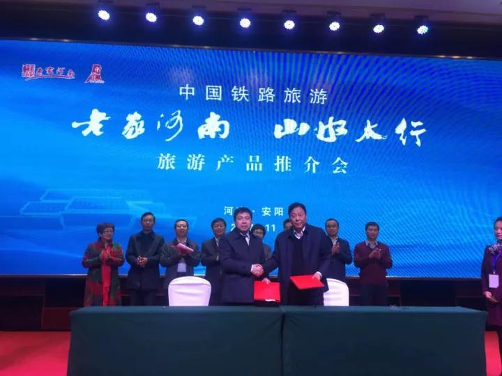 推介会上,“老家河南山水太行”旅游推广联盟推介了“老家河南 山水太行”旅游产品,发布了相关优惠政策,并与全国铁旅联盟签订了战略合作协议。安阳市旅游局与中原铁道国旅就2018年组织10趟以上专列进安阳达成合作意向。