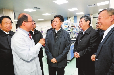 谢伏瞻先后来到河南大学棉花生物学国家重点实验室、抗体药物开发技术国家地方联合研究工程实验室,郑州大学绿色催化研究中心、精准营养研究实验室等处察看,了解学科建设、人才培养、成果转化等情况。