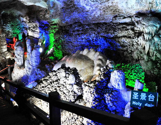 著名的雪花洞由石葡萄、石珊瑚、石花(即雪花)等自然组成了一百七十三米的“雪花长廊”,宛如一座地下水晶宫。雪花洞以其独特的风姿傲居世界群洞之首,被专家定为“天下第一雪花洞”。