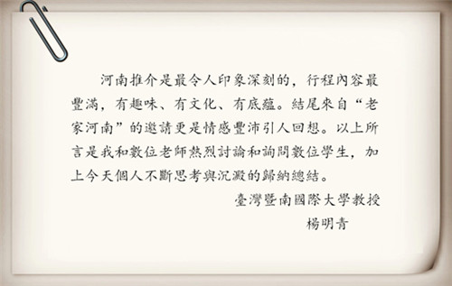 台湾暨南国际大学教授杨明青说:“河南推介是最令人印象深刻的,行程内容最丰满,有趣味、有文化、有底蕴。结尾来自‘老家河南’的邀请更是情感丰沛引人回想。这是我和数位老师热烈讨论并询问数位学生的结论。”