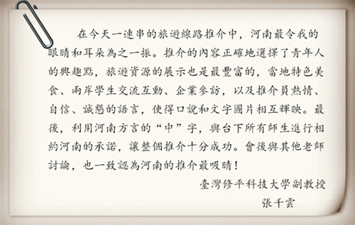 台湾修平科技大学副教授张千云说:“在今天一连串的旅游线路推介中,河南最令我的眼睛和耳朵为之一振。推介的内容正确地选择了青年人的兴趣点,当地特色美食、两岸学生交流互动、企业参访,以及推介员热情、自信、诚恳的语言,使得口说和文字图片相互辉映。会后与其他老师讨论,也一致认为河南的推介最吸睛!”