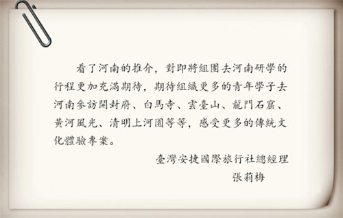 台湾安捷国际旅行社总经理张莉梅说:“看了河南的推介,对即将组团去河南研学的行程更加充满期待,期待组织更多的青年学子到河南研学,感受更多的传统文化体验项目。”