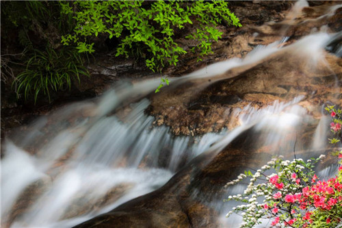 河水在幽谷里蜿蜒流出,时而奔腾咆啸,时而潺潺倘佯,可谓九曲回肠。峡谷内山高谷深,飞瀑连绵,瀑潭相连,错落有致。一年四季长青,苍松翠竹点缀在万顷碧渡之中,奇花异卉开放于茫茫群山之上,令人心旷神怡,美不胜收。