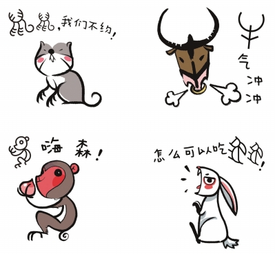 据了解,这两套表情包中“生肖甲骨文”是以十二生肖为主题设计的。设计者将几何化的甲骨文字转化成更加直观形象的动物,再配上“你说神马”、“小鹿乱撞”、“猴赛雷”等这些当下时尚的网络用语。每一个小表情都以搞笑又可爱的甲骨小动物的表情定格。